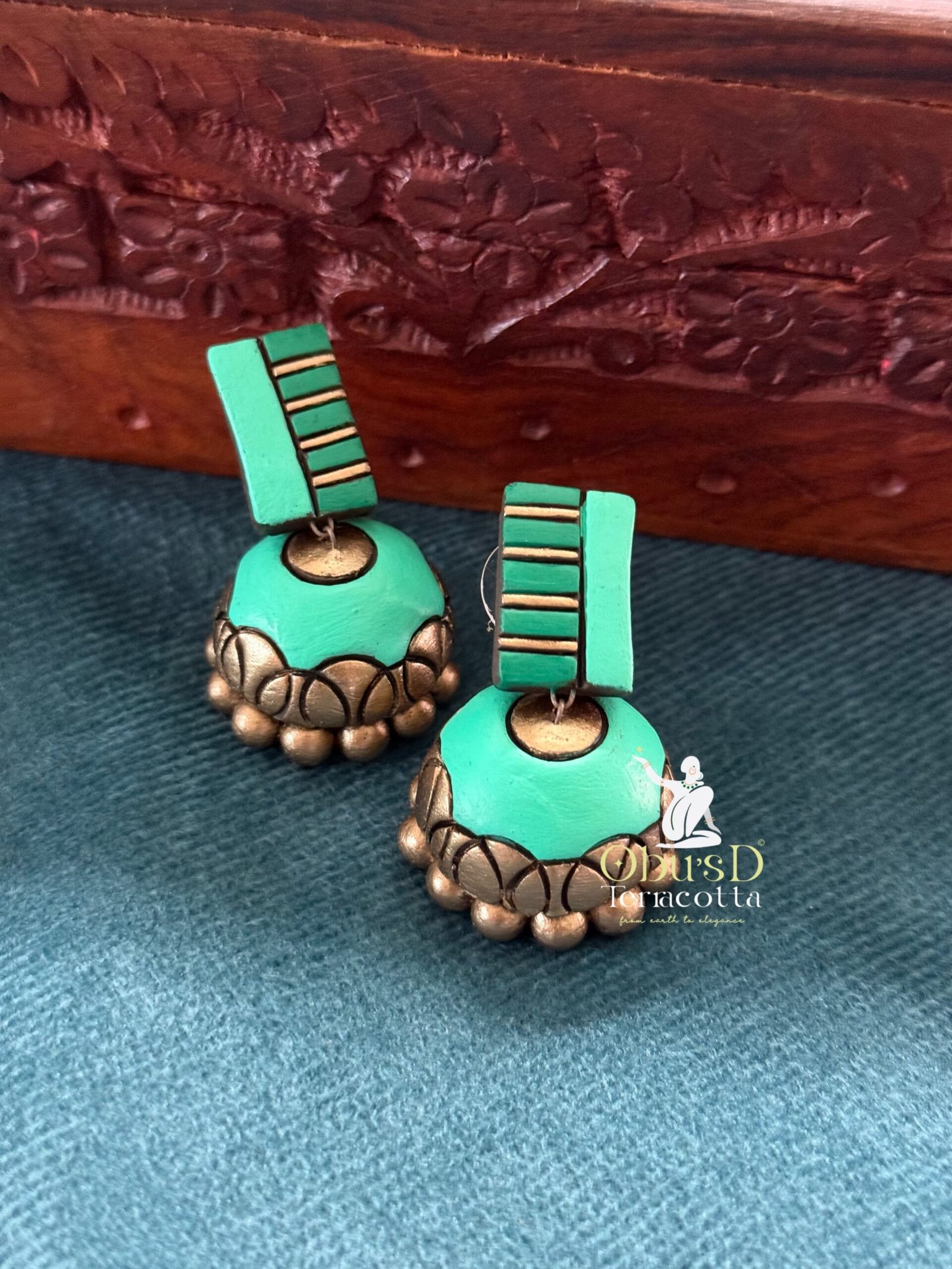 These medium-sized terracotta jhumukas are handmade with exquisite craftsmanship, showcasing a vibrant green hue that adds a refreshing pop of color to any outfit. Lightweight and elegantly designed, they combine traditional charm with modern aesthetics, making them perfect for festive occasions, casual ethnic wear, or special celebrations. Their intricate detailing and artisanal appeal highlight the beauty of handmade terracotta jewelry.