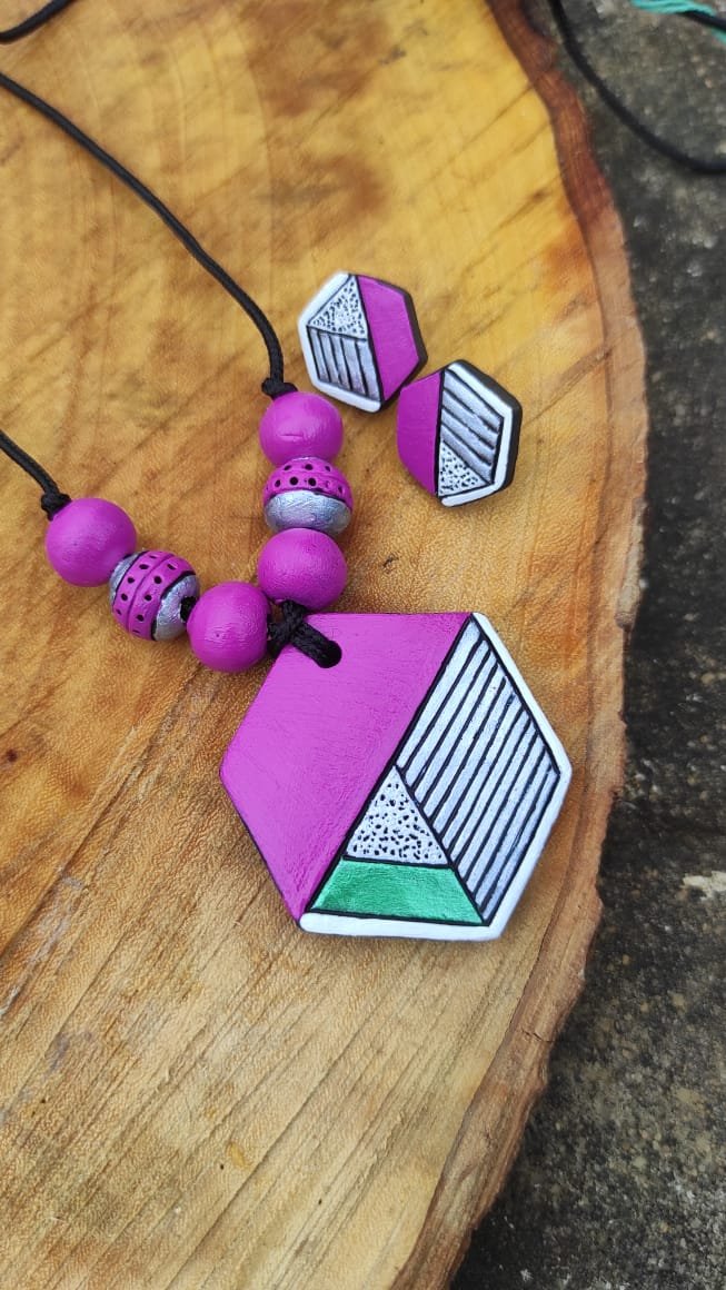 Stylish geometric terracotta jewelry set with bold pink tones and minimal pattern detailing.